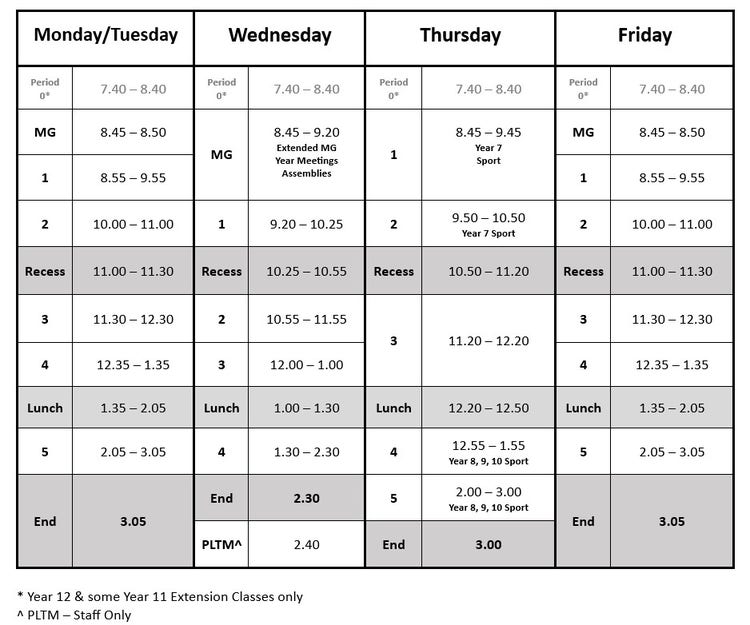 Our school day is structured around a clear timetable. School begins each day with Mentor Group. Understanding the bell times helps students get the most out of each part of the day.