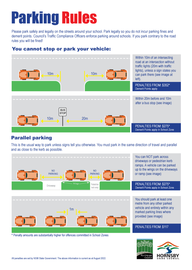 Parking is not available on school grounds. Parents and visitors should use the surrounding streets to park when visiting the school. Please ensure you follow road and safety rules and respect our neighbours.